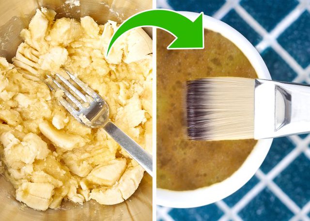 1- Shtyp ¼ e një bananeje deri sa të krijohet një pure. Pastaj vendosni një shtresë të hollë në ballë dhe lëreni për 15 deri në 20 minuta. Pas kësaj, shpëlajeni me ujë të ngrohtë dhe do ta ndieni ballin më të butë dhe të lagët.