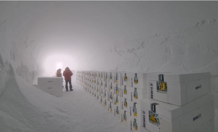 Bërthamat e akullit PNRA/IPEV 15 që duken si të ngrira dhe kanë diametër rreth 15 cm janë brenda kanaleve metalike. Ato janë të grumbulluara mbi rafte druri dhe metali.