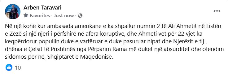 “Në një kohë kur ambasada amerikane e ka shpallur numrin 2 të Ali Ahmetit në Listën e Zezë si një njeri i përfshirë në afera koruptive, dhe Ahmeti vet për 22 vjet ka keqpërdorur popullin duke e varfëruar e duke pasuruar nipat dhe Njerëzit e tij , dhënia e Çelsit të Prishtinës nga Përparim Rama më duket një absurditet dhe ofendim sidomos për ne, Shqiptarët e Maqedonisë”, shkruan Taravari.