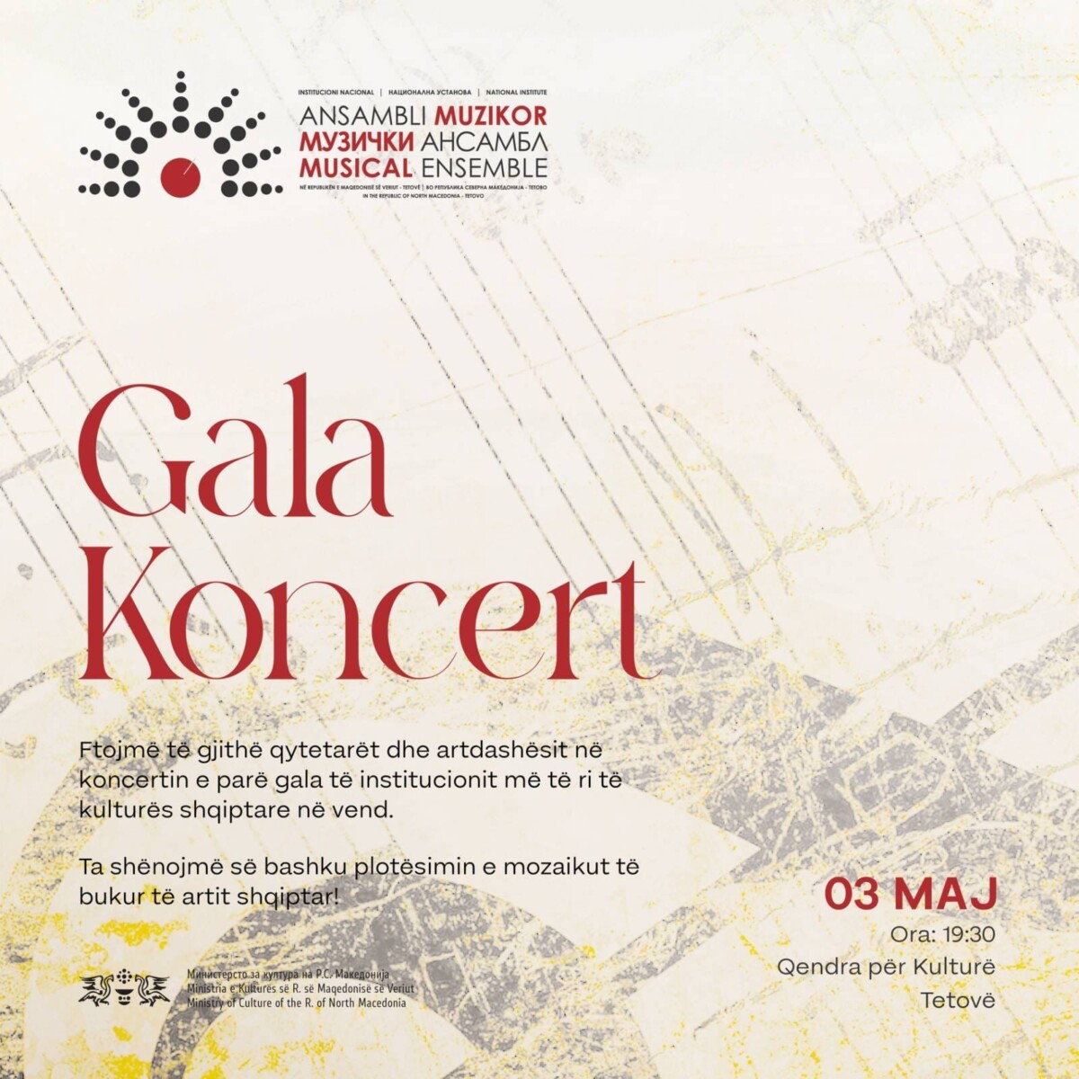 Kulturë Ansambli Muzikor sjell në skenë koncertin e parë gala By Desk 29/04/2024 11:25 Share FacebookXWhatsAppEmailViber TË FUNDIT BotëDesk - 23/04/2026 23:41Sllovenia do të transmetojë filma për Palestinën në vend të Eurovision BotëDesk - 23/04/2026 23:04Trumpi thotë se s’do të nxitojë t’i japë fund luftës me Iranin, përjashton përdorimin e armës bërthamore MaqedoniDesk - 23/04/2026 22:38Zbulohet rrjet për tregti ilegale me botoksë dhe fillerë! Arrestohen mjekë nga klinikat e Shkupit dhe ordinanca private BotëDesk - 23/04/2026 21:29Izraeli pret “dritën jeshile” nga SHBA-ja për ofensivë ndaj Iranit, thotë zyrtari izraelit BotëDesk - 23/04/2026 20:21Pas tensioneve SHBA-Iran, dy anije me mallra kalojnë pa incidente Ngushticën e Hormuzit Desk Institucioni nacional “Ansambli Muzikor në Republikën e Maqedonisë së Veriut” Tetovë, fton qytetarët dhe artdashësit në koncertin e parë gala të institucionit më të ri të kulturës shqiptare në vend. Share FacebookXWhatsAppEmailViber