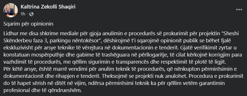 “Bëhet fjalë ekskluzivisht për arsye teknike të vërejtura në dokumentacionin e tenderit. Gjatë verifikimit zyrtar u konstatuan mospërputhje dhe gabime të trashëguara në përllogaritje, të cilat kërkojnë korrigjim para vazhdimit të procedurës, me qëllim sigurimin e transparencës dhe respektimit të plotë të ligjit”, tha ajo.