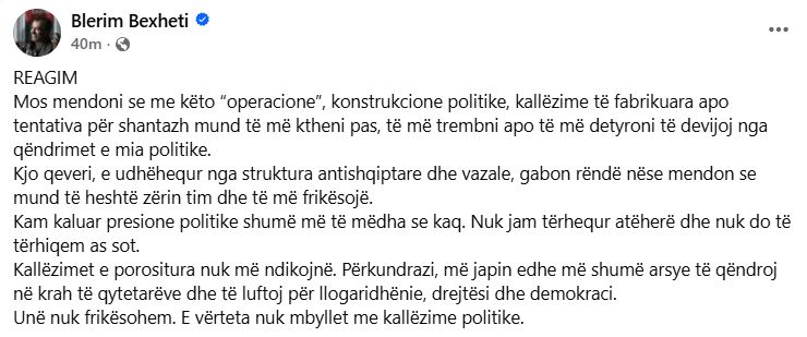 “Mos mendoni se me këto “operacione”, konstrukcione politike, kallëzime të fabrikuara apo tentativa për shantazh mund të më ktheni pas, të më trembni apo të më detyroni të devijoj nga qëndrimet e mia politike. Kjo qeveri, e udhëhequr nga struktura antishqiptare dhe vazale, gabon rëndë nëse mendon se mund të heshtë zërin tim dhe të më frikësojë. Kam kaluar presione politike shumë më të mëdha se kaq. Nuk jam tërhequr atëherë dhe nuk do të tërhiqem as sot. Kallëzimet e porositura nuk më ndikojnë. Përkundrazi, më japin edhe më shumë arsye të qëndroj në krah të qytetarëve dhe të luftoj për llogaridhënie, drejtësi dhe demokraci. Unë nuk frikësohem. E vërteta nuk mbyllet me kallëzime politike”, ka shkruar Bexheti.