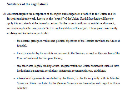 Negociata do të fillojnë me kapitujt 23 dhe 24 për prokurime publike dhe institucione demokratike dhe reformat në administratën publike. Korniza negociuese parasheh edhe tre instrumente ndëshkuese. Klauzola e pezullimit, e disbalancimit dhe klauzola e reversibilitetit. Me këto instrumente të reja, i jepet mundësia shtetit tonë, që nëse nuk tregon sukses në negociata, procesi i negociatave mund të ndërpritet apo edhe të ritkhehen kapitujt të cilët tashmë janë mbyllur. Aktivizimi i instrumenteve ndëshkuese mundet që përveç nga Komisioni i BE-së mund të aktivizohet edhe me kërkesë të shteteve anëtare. Megjithatë për të njëjtat duhet të votojnë dy e treta e shteteve anëtare. Instrumentet e ndëshkimit do të përcaktojnë edhe sasinë e IPA fondeve për vendin tonë.