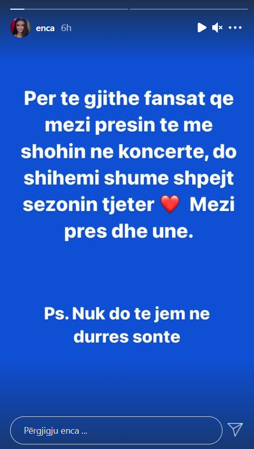 Kështu ka njoftuar vetë Enca përmes një postimi në Instagram, teksa fansat i ka njoftuar se do të shihen sezonin tjetër dhe se që nga tani mezi po pret të takohet me ta.