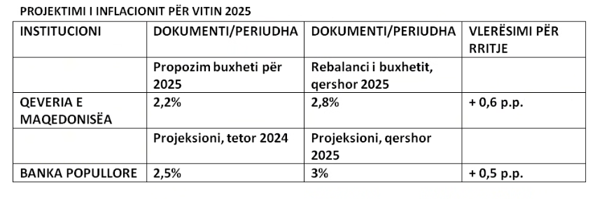 Në mënyrë të sinkronizuar, në vetëm dy ditë Qeveria dhe Banka Popullore i ulën pritjet e tyre për rritjen e inflacionit për vitin 2025. Që dje me publikimin e rebalancit, Ministria e financave pret që inflacioni të rritet nga prognoza fillestare prej 2.2% në nivel vjetor në 2.8% apo për 0.6 pikë përqindje shtesë. Sot gjithashtu me korrigjim pesimist doli edhe Banka popullore e cila vlerëson se inflacioni do të jetë 3%, në vend të 2.5% siç u parapa në tetor.