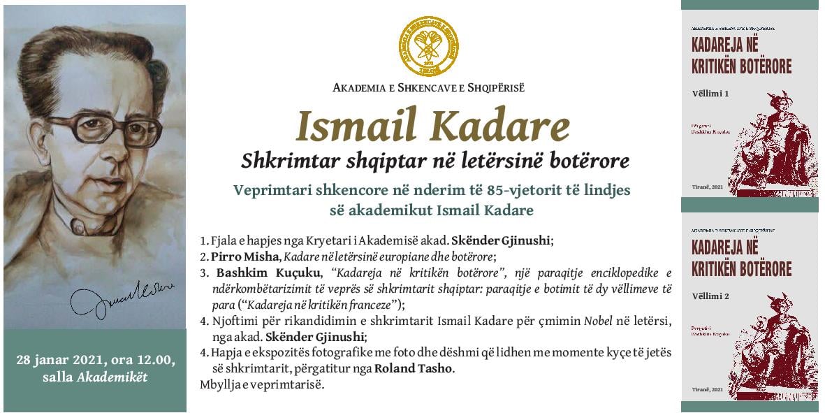 Akademia e Shkencave e Shqipërisë, në nderim të 85-vjetorit të akademikut Ismail Kadare, do të organizojë një veprimtari shkencore me temën “Ismail Kadare, shkrimtar shqiptar në letërsinë botërore”. Veprimtaria do të mbahet më 28 janar 2021, ora 12.00, në Akademinë e Shkencave, në sallën “Akademikët”.