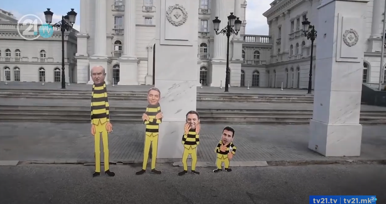 Karikatura të Zoran Zaevit, Bujar Osmanit, Nikolla Dimtrovit e Vllado Buçkovskit vendosi sot VMRO-DPMNE para objektit të Qeverisë. Anëtari i VMRO-DPMNE-së Aleksandar Pandov deklaroi se këta funksionarë janë dalltonist të cilët nuk guxojnë të vendosin për ndryshimin e identitetit maqedonas.