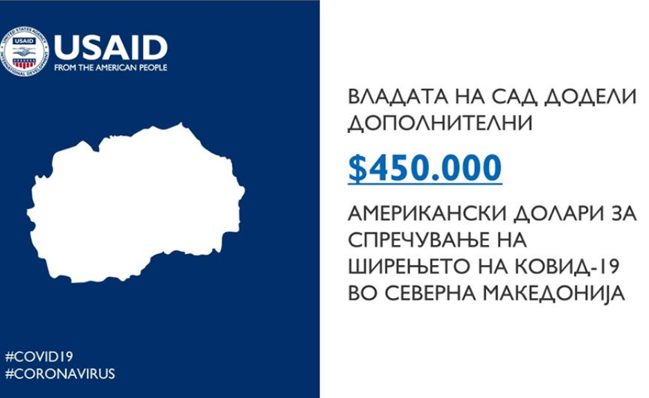 Qeveria e Shteteve të Bashkuara të Amerikës nëpërmjet Agjencisë së ShBA-së për zhvillim ndërmkombëtar USAID – US Agency for International Development, ka ndarë 450 mijë dollarë amerikanë shtesë si ndihmë për Maqedoninë e Veriut në luftën kundër pandemisë së virusit Kovid-19.