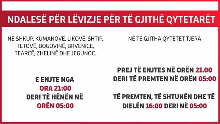 Në komunat tjera, ora policore sot do të fillojë në ora 21:00 dhe përfundon ditën e nesërme në ora 5 të mëngjesit. Të premten, të shtunën dhe të dielën do të fillojë prej orës 16:00 deri nesër në ora 05:00.