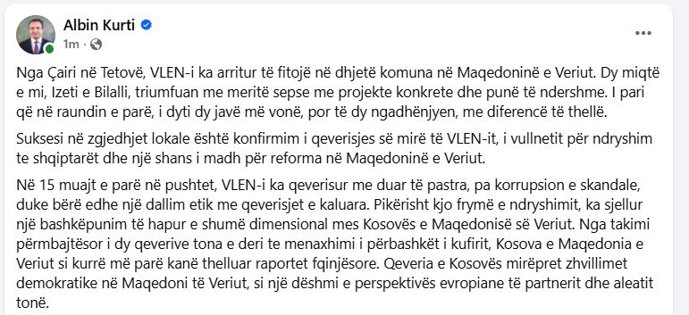 “Nga Çairi në Tetovë, VLEN-i ka arritur të fitojë në dhjetë komuna në Maqedoninë e Veriut. Dy miqtë e mi, Izeti e Bilalli, triumfuan me meritë sepse me projekte konkrete dhe punë të ndershme. I pari që në raundin e parë, i dyti dy javë më vonë, por të dy ngadhënjyen, me diferencë të thellë. Suksesi në zgjedhjet lokale është konfirmim i qeverisjes së mirë të VLEN-it, i vullnetit për ndryshim te shqiptarët dhe një shans i madh për reforma në Maqedoninë e Veriut. Në 15 muajt e parë në pushtet, VLEN-i ka qeverisur me duar të pastra, pa korrupsion e skandale, duke bërë edhe një dallim etik me qeverisjet e kaluara. Pikërisht kjo frymë e ndryshimit, ka sjellur një bashkëpunim të hapur e shumë dimensional mes Kosovës e Maqedonisë së Veriut. Nga takimi përmbajtësor i dy qeverive tona e deri te menaxhimi i përbashkët i kufirit, Kosova e Maqedonia e Veriut si kurrë më parë kanë thelluar raportet fqinjësore. Qeveria e Kosovës mirëpret zhvillimet demokratike në Maqedoni të Veriut, si një dëshmi e perspektivës evropiane të partnerit dhe aleatit tonë”, ka shkruar Kurti.