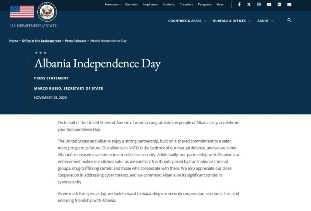“Në emër të Shteteve të Bashkuara të Amerikës, dua të përgëzoj popullin e Shqipërisë për festimin e Ditës së Pavarësisë. Shtetet e Bashkuara dhe Shqipëria gëzojnë një partneritet të fortë, i ndërtuar mbi një angazhim të përbashkët për një të ardhme më të sigurt dhe më të begatë. Aleanca jonë në NATO është themeli i mbrojtjes tonë të përbashkët, dhe ne e mirëpresim rritjen e angazhimit të Shqipërisë në sigurimin tonë kolektiv. Gjithashtu, partneriteti ynë me organet e zbatimit të ligjit në Shqipëri i bën qytetarët tanë më të sigurt në përballjen me kërcënimet nga grupet kriminale ndërkombëtare, kartelët e trafikut të drogës dhe ata që bashkëpunojnë me ta. Ne vlerësojmë gjithashtu bashkëpunimin e ngushtë në trajtimin e kërcënimeve kibernetike dhe përgëzojmë Shqipërinë për përparimet e saj të rëndësishme në fushën e sigurisë kibernetike. Ndërsa shënojmë këtë ditë të veçantë, shpresojmë të zgjerojmë bashkëpunimin tonë në fushën e sigurisë, lidhjet ekonomike dhe miqësinë e qëndrueshme me Shqipërinë”, ka shkruar Rubio.