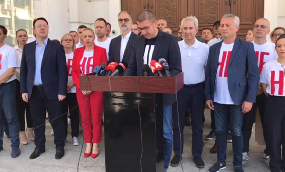 “Nismë e deputetëve si garanci me të cilën para qytetarëve obligohemi për këtë premtim tonin, me qëllim bllokim të tradhtisë të kësaj Qeverie, janë deklaratat e deputetëve të noterizuara, se me vetëdije të shëndoshë nuk do të pranojnë ndryshim të kushtetutës, e këtë e garantojnë me nderin e tyre, me vetëdijen dhe dorëheqjen e cila menjëherë hyn në fuqi nëse nuk ndodh kjo. Unë besoj se asnjë deputet nuk do ta miratojë këtë tradhti, e për këtë e keni fjalën time se kjo nuk do të ndodhë, këtu janë ato deklarata”, tha Mickoski.