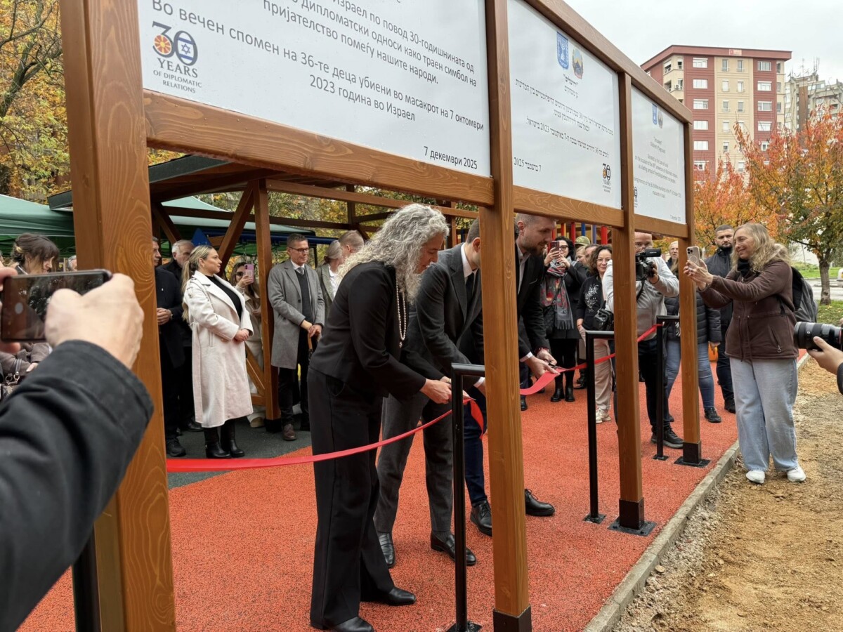 Ambasadorja e Izraelit në Maqedoni, Vivi Aisen, bashkë me ministrin e Punëve të jashtme Timço Mucunski dhe kryetarin e Aerodromit Dejan Miteski, kanë përuruar sot në Shkup këndin e lojërave “Jerusalem”, përcjell TV21. Ambasadorja Aisen thotë se parku i dedikohet 36 fëmijëve të vrarë më 7 tetor.