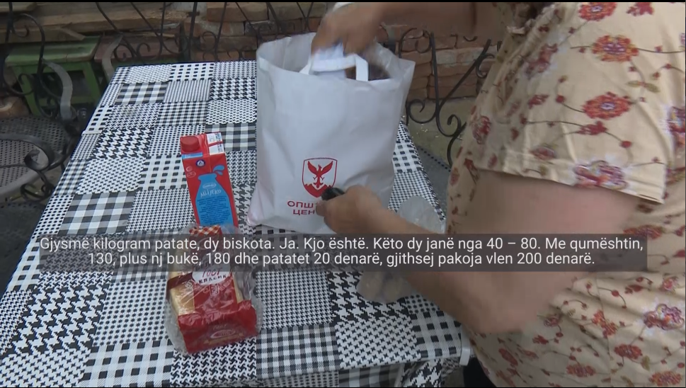 Nevojtarja: “Gjysmë kilogram patate, dy biskota. Ja. Kjo është. Këto dy janë nga 40 – 80. Me qumështin, 130, plus nj bukë, 180 dhe patatet 20 denarë, gjithsej pakoja vlen 200 denarë.