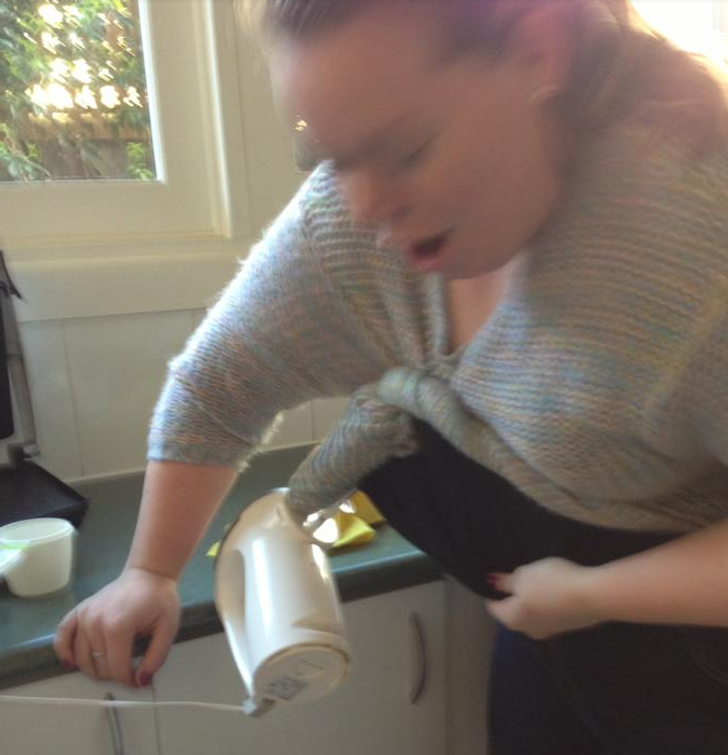 Një grua që trikot e saj mbërtheu në një mikser