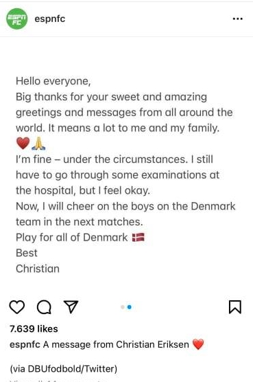 Ka falenderuar të gjithë fansat e tij, për mesazhet e shumta që i kanë dërguar atij dhe familjes së tij, duke shprehur shqetësimin për gjendjen e vështirë shëndetësore të Eriksenit.