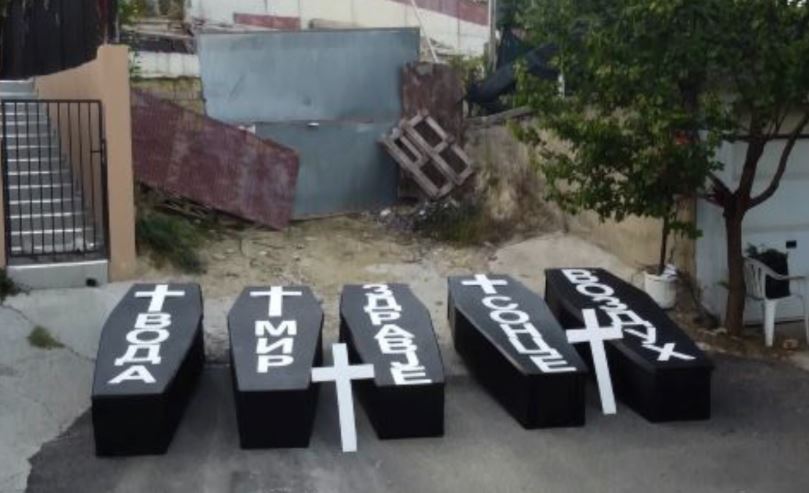 Pesë arkivole mbi të cilat shkruan ujë, paqe, shëndet, diell dhe ajër, u panë para parcelës ku duhet të ndërtohet një ndërtesë.