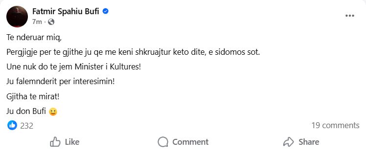“Te nderuar miq, Pergjigje per te gjithe ju qe me keni shkruajtur keto dite, e sidomos sot. Une nuk do te jem Minister i Kultures! Ju falemnderit per interesimin! Gjitha te mirat! Ju don Bufi”, ka shkruar Spahiu.