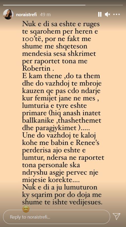 “Nuk e di sa është e rrugës të sqarohem për herën e 1oo-të, por në fakt më shumë më shqetëson mendësia sesa shkrimet për raportet tona me Robertin. E kam thënë, do ta them dhe do vazhdoj të mbrojë kauzën që pas çdo ndarje kur fëmijët janë në mes, lumturia e tyre është primare (hiq anash inatet ballkanike, thashethemet dhe paragjykimet )….. Unë do vazhdoj të kaloj kohë me babin e Renees përderisa ajo është e lumtur, ndërsa në raportet tona personale s’ka ndryshu asgjë përveç një miqësie korrekte…. Nuk e di a ju lumturon ky sqarim, por do doja më shumë të ishte vedijesues”, ka shkruar Nora në rrjetin social Instagram.