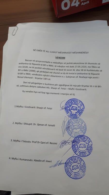 Ky vendim hyn në fuqi sot, gjegjësisht është nënshkruar nga vetë Fetau, myftiu i Shkupit, Qenan Ismaili, myftiu i Tetovës, Qani Nesimi, pastaj myftiu i Kumanovës, Abedin Imeri, myftiu i Strugës, Salim Sulejmani, dhe pothuajse të gjithë myftinjtë e tjerë. Në të njëjtën kohë, ky vendim u nënshkrua nga Mustafa Dauti, kryetar i Organizatës humanitare që vepron brenda BFI-së, “Hilall”, profesor Shaban Sulejmani, dekan në Fakultetin e Shkencave Islame, Drejtori për Diasporë, Selver Xhemaili, anëtari i Rijasetit, Fadil Ramadani dhe të tjerë.