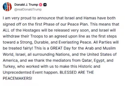 “Kjo do të thotë që të gjithë pengjet do të lirohen shumë shpejt dhe Izraeli do të tërheqë trupat e tij në vijën e rënë dakord, si hapi i parë drejt një paqeje të fortë, të qëndrueshme dhe të përhershme,” shkroi Trampi.