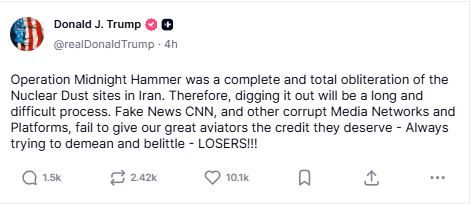 “Operacioni ‘Çekiçi i Mesnatës’ çoi në shkatërrimin e plotë dhe përfundimtar të kapaciteteve bërthamore të Iranit. Pikërisht për këtë arsye, nxjerrja e ‘pluhurit bërthamor’ do të jetë një proces i gjatë dhe i vështirë”, shkroi Trump në profilin e tij në rrjetin social “Truth Social”.
