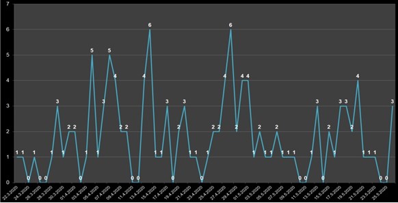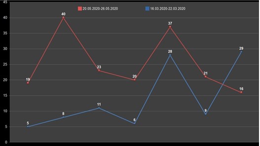 Me ngjyrë të kaltër është shënuar numri i të prekurve 7 ditë para shpalljes së orës policore. Aso kohe ka pasur nga 5 deri në 29 raste të reja. Me ngjyrë të kuqe është shënuar numri i të infektuarve të rinj javën e fundit, para se të hiqet ora policore. Kështu që, mund të shihet se numri është dyfish, në disa ditë edhe trefish më i lartë. Ka pasur nga 16 deri në 40 raste të regjistruar.